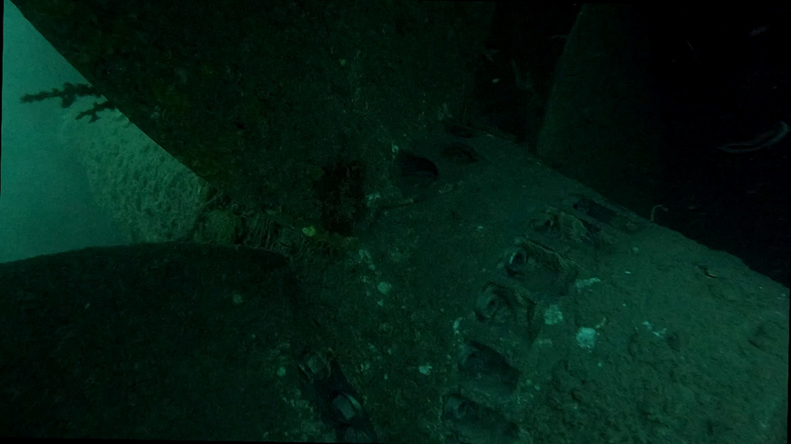 Later dives, however, identified signs of mechanical alteration. Observations included manipulated fasteners and attempts to loosen structural components associated with the propeller assembly. Photographic and video records documented multiple individuals operating from small wooden vessels positioned above the wreck site. Surface activity included the handling of ropes, lines, and deployed equipment. In several recordings, a diver was observed partially submerged near one of the vessels. Additional footage captured vessels maintaining proximity while equipment was managed at the surface. These combined observations suggest a coordinated salvage effort. Follow-up surveys confirmed that the propeller assembly had been removed. The now-empty propeller housing provides visible evidence of this alteration.